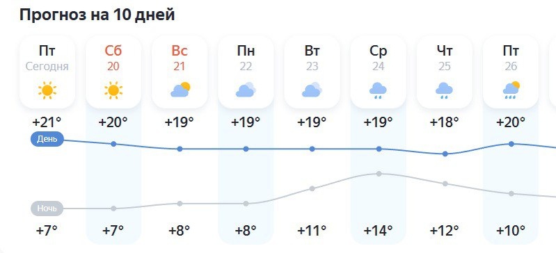 Ночная температура воздуха составит около +8 градусов. В воскресенье днем облачно с прояснениями. В светлое время суток воздух прогреется до +18 градусов. К вечеру столбик термометра опустится на 4-5 градусов и станет совсем хмуро. Осадков в течение дня не обещают.