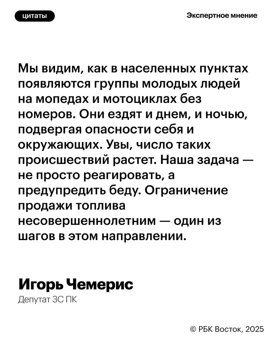 В ответ на пост Законопроект, предполагающий запрет продажи бензина несовершеннолетним в Приморье, уже получил положительное заключение губернатора и прошел оценку регулирующего воздействия в Минэкономразвития, рассказали РБК Восток в ЗС ПК Депутат Игорь Чемерис отметил, что на данный момент остаются некоторые нерешенные вопросы. В частности, связанные с покупкой топлива через приложения или терминалы без участия кассира. Эти нюансы, по словам депутата, будут прорабатаны ко второму и третьему чтению. 😃Подписывайтесь на РБК Восток