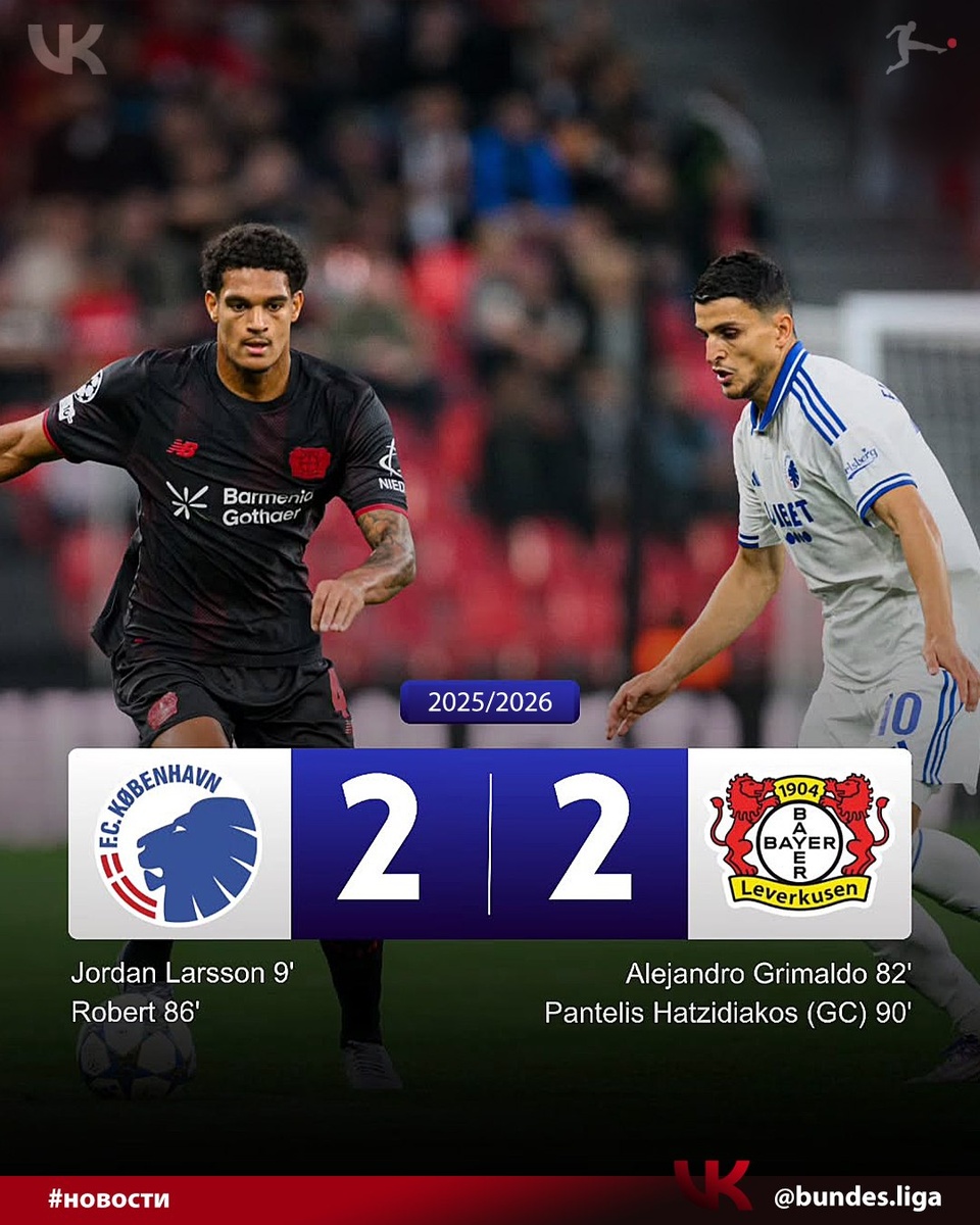 "Байер" сыграл вничью с "Копенгагеном" 2:2 ⚡ в рамках первого тура общего этапа Лиги Чемпионов 🏆 ⚽ 09' Джордан Ларссон (1:0) ⚽ 82' Алехандро Гримальдо (1:1) ⚽ 87' Роберт (2:1) ⚽ 90+2' Пантелис Хацидиакос (2:2) - автогол