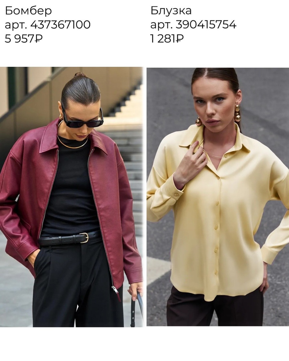 - Офис/встреча: блузка сливочная (арт. 390415754) + юбка песочная (арт. 500340591) + лодочки/сапоги + лаконичные серьги. Сверху — бомбер бордо (арт. 437367100) для контраста.
