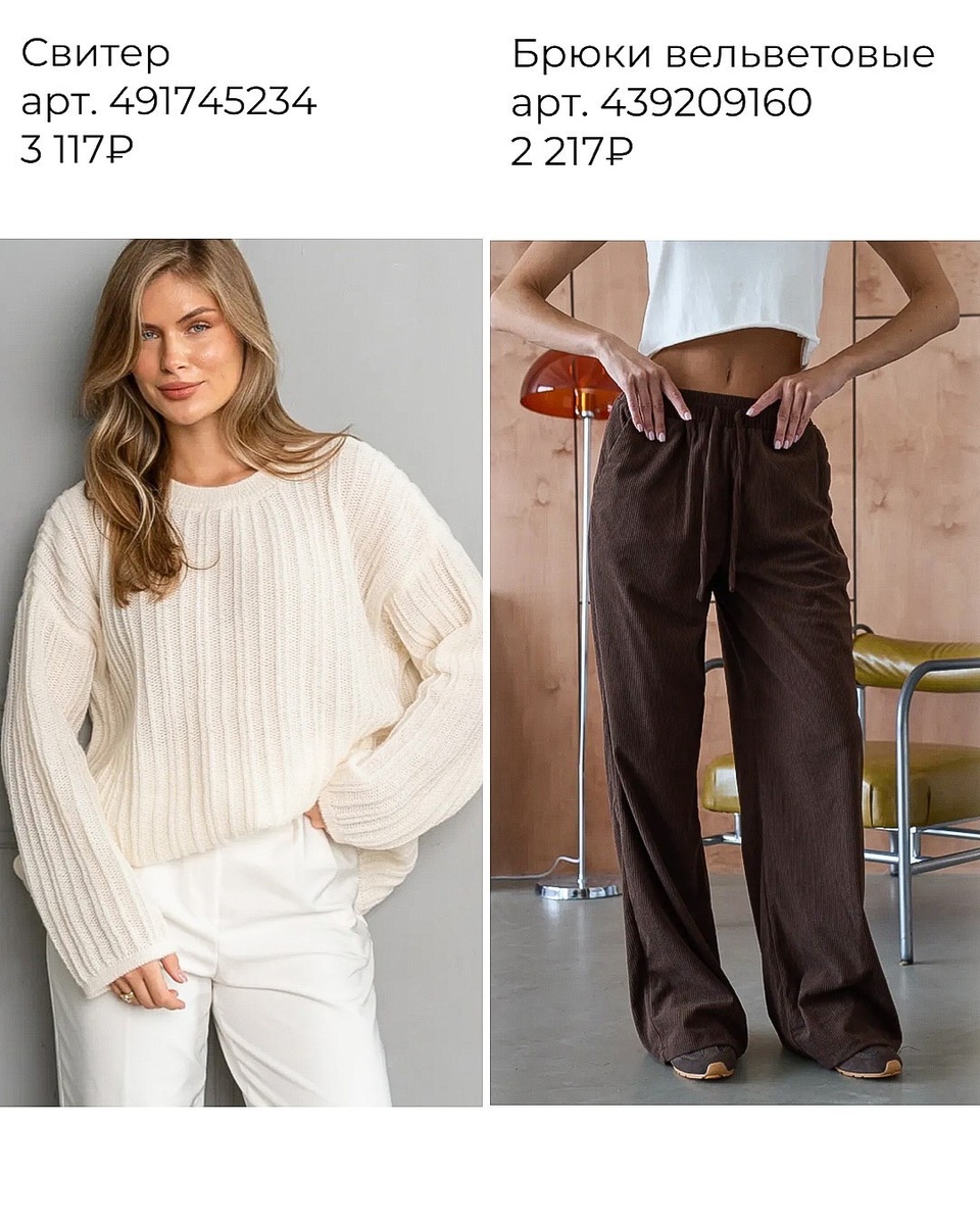- Правило баланса: к фактурному низу (вельвет) — гладкий верх; к объёмному свитеру — структурная сумка/обувь; в образе оставляйте 1–2 акцента, остальное — база.