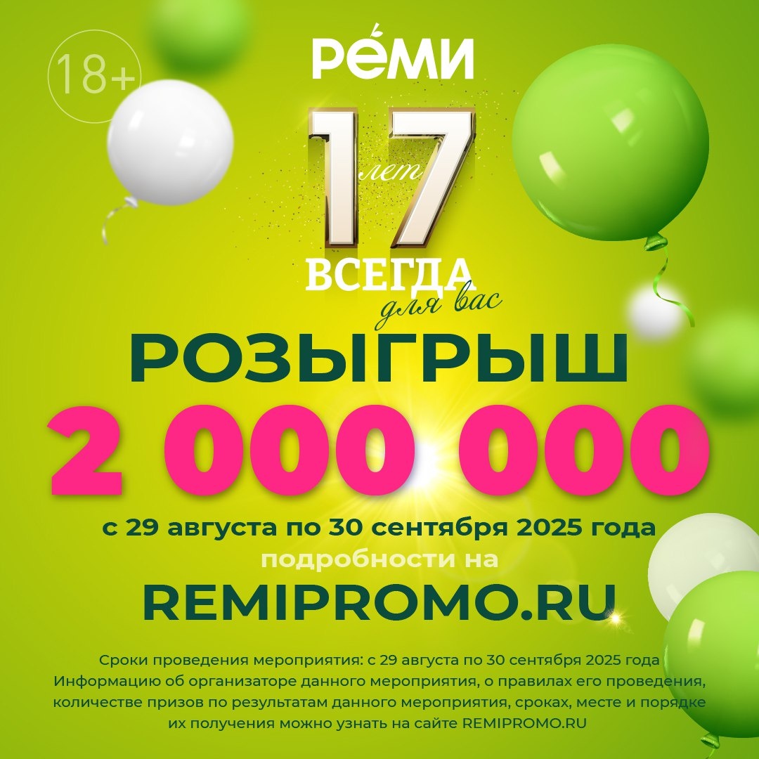 Напоминаем, «Реми» на Борисенко, 35 работает и радует вас ассортиментом и регулярными акциями В честь 17-летия ретейлера, совершая покупки в гипермаркете до 30 сентября, вы можете стать участниками розыгрыша 2 миллионов рублей🔥 ✅Еженедельно среди победителей разыгрывается 75000 руб., а также бонусы на карту лояльности «Реми – Клуб привилегий» ❗Информация и правила на remipromo.ru ✅А для ваших детей сеть запустила милую плюшевую акцию «Обнимаши – ваши краши» До 30 ноября совершайте покупки на сумму от 600 руб., собирайте фишки и клейте их в специальный буклет, получая скидку на покупку одного из девяти героев-обнимашей: 🐝Летней пчёлка 🐧Яркого дятла 🦫Ворчливого бобра и других 5 наклеек – минимальная скидка, дающая право приобрести игрушку за 899 499 руб. 10 наклеек – максимальная скидка, дающая право приобрести игрушка за 899 299 руб. Вся информация по ссылке До встречи в «Реми»🛍️
