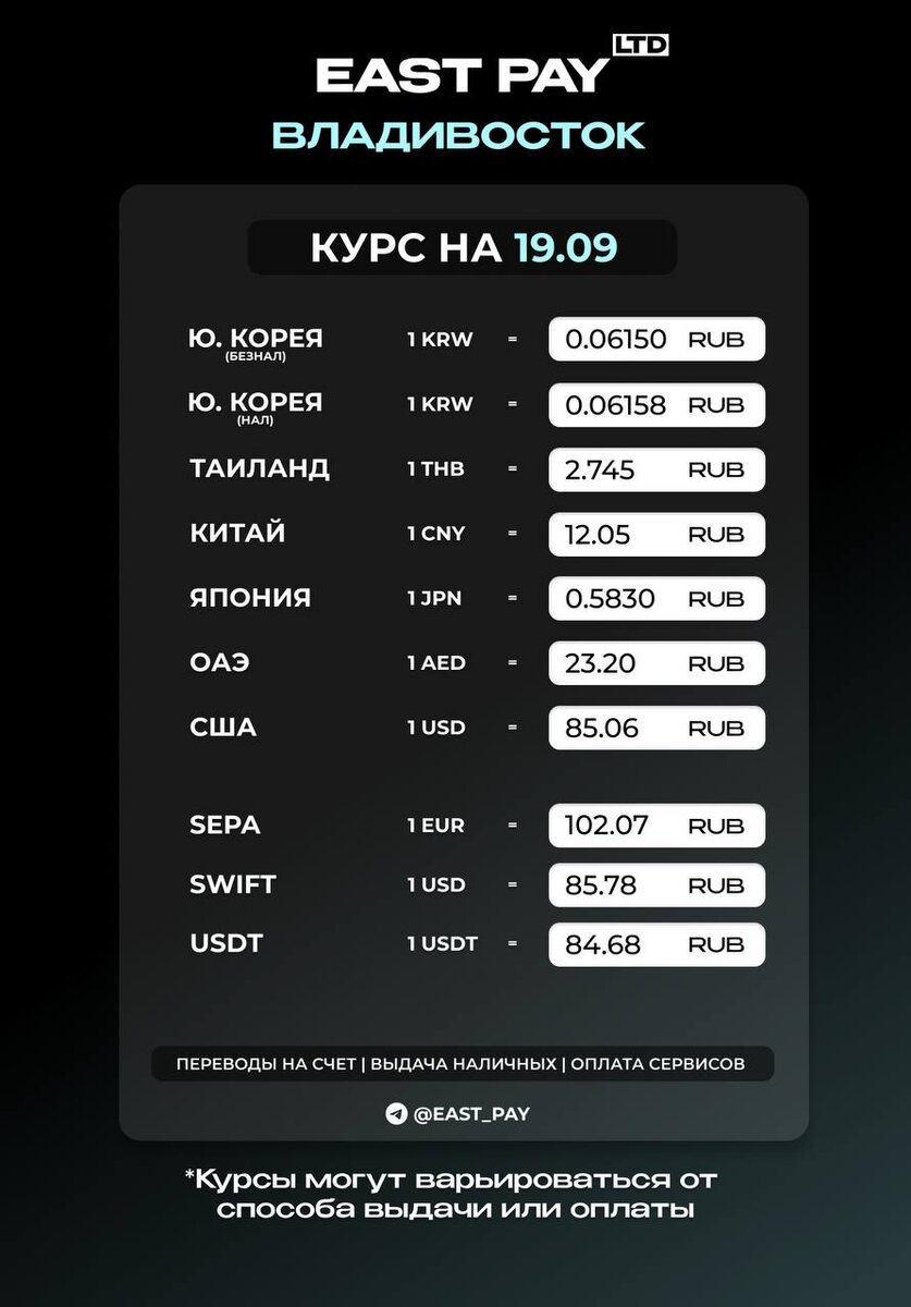 💙SWIFT / SEPA переводы 💙Пополнение зарубежных счетов 💙Выдача наличных за границей 💙Криптовалюты 🔘В течение дня курс может меняться. Рекомендуем уточнять актуальный курс у менеджера. ❗️ВАЖНО: мы получили лицензию и открыли офис в Корее. Подробности можете узнать у менеджера. 🔴🔴🔴🔴🔴🔴🔴🔴🔴🔴 🟠Написать менеджеру: @east_pay_world 🟠Сделать просчет самостоятельно в боте: @East_PaySer_bot ✈️ Подписаться на «East Pay»