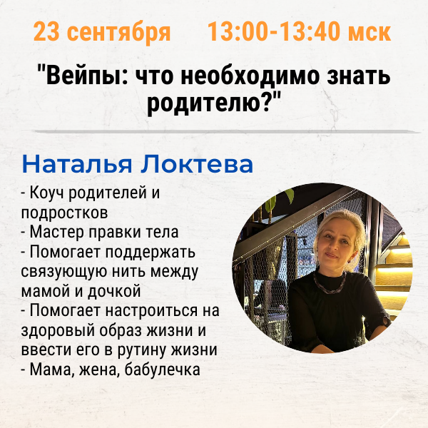 Одна из больших опасностей современности – это вейпы. Их опасность еще в том, что зачастую родители даже не могут отследить их употребление подростками – ведь они практически без запаха. Это не сигареты, которые обнаружить довольно легко. Поэтому если у ребенка есть в квартире свое личное пространство, отдельная комната – то он может скрывать вейпы от зорких глаз родителей довольно продолжительное время. Наталья Локтева, коуч родителей и подростков, сама как мама в этом году столкнулась с темой вейпов у своей дочери. Наталья выступит 23 сентября в 13:00мск с темой «Вейпы: что необходимо знать родителю?» Смотрите выступление Натальи на Первом международном фестивале детско-родительского коучинга: https://coachforkids.org/coachkidsfest2025