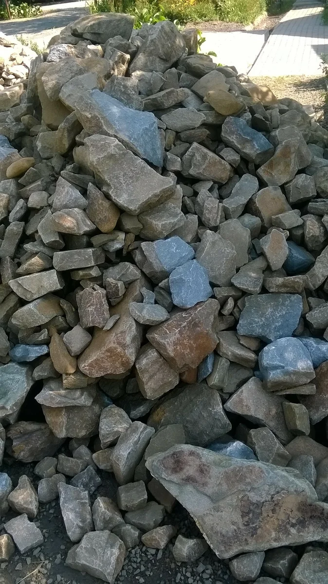 Спустя две недели с момента бетонирования фундамента, я приступил к сооружению цокольной части дома. Выбор бутового камня для будущего цоколя был обусловлен тем, что природный камень - реально долговечный материал, который смотрится не хуже современных облицовочных материалов и прочность на сжатие у него расценивается как 1200 кг на кв.см (М1200), то есть он настолько крепок, что выдерживает давление более 1 тонны на 1 кв. см. К тому же ему не страшны никакие погодные условия. Закупленный камаз бута: Я пошел по пути кладки цоколя, чтобы в дальнейшем не заморачиваться с облицовкой. Сразу сделал и забыл на долгие годы. Всё дело в том, что ни плиточный клей, ни специальный клей - не способны на долгое время зафиксировать камень как плитку, в связи со строением материала. Бутовый камень по своей структуре не имеет пор, поэтому клеящий состав не может нормально держать данный материал. Напротив же, в кладке бут зажат со всех сторон строительным раствором на всю глубину камня, и остается неп