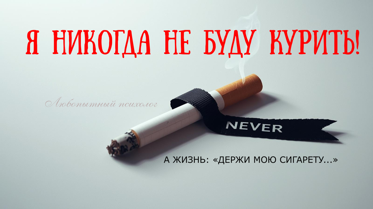 Привет и снова ты на канале Любопытного психолога! А у вас было так, что зарекались от чего-то и говорили – «НИКОГДА я этого не сделаю…», а жизнь всё равно подсовывала именно это? У меня уж точно было и вот вам пример. В подростковом возрасте я был яростным противником курения. Настолько категоричным, что даже с лучшими друзьями ругался, если они затягивались сигаретой. «Я НИКОГДА не буду курить!» - заявлял я с праведным гневом, морщась от табачного дыма.