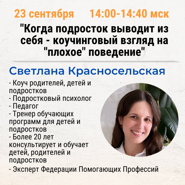 На Первом международном фестивале детско-родительского коучинга 23 сентября, в день «Для родителей», мы специально выделили два выступления с темами про подростков. Есть две жалобы, с которыми родители подростков приходят к коучам довольно часто: - «плохое» поведение ребенка - его нежелание что-либо делать В 14:00мск Светлана Красносельская выступит с темой «Когда подросток выводит из себя - коучинговый взгляд на "плохое" поведение». В 17:00мск Юлия Удодова расскажет что делать, если подросток ничего не хочет. О Первом международном фестивале детско-родительского коучинга: https://coachforkids.org/coachkidsfest2025