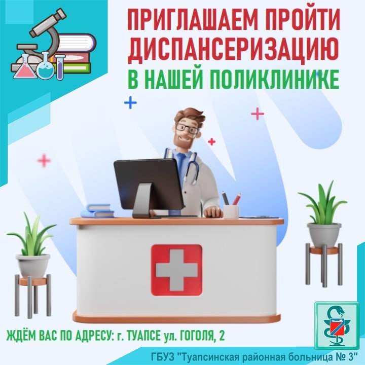 ПРИГЛАШАЕМ БЕСПЛАТНО ПРОЙТИ ДИСПАНСКРИЗАЦИЮ В НАШЕЙ ПОЛИКЛИНИКЕ Кто может пройти бесплатную диспансеризацию? Для прохождения диспансеризации и профилактического медицинского осмотра необходимо иметь при себе паспорт и полис ОМС и обратиться в поликлинику, в которой получаете первичную медико-санитарную помощь (к которой прикреплены). 18 лет и старше – можно каждый год проходить профилактический медицинский осмотр. От 18 до 39 лет – диспансеризацию проходит 1 раз в 3 года (в 18, 21, 24, 27, 30, 33, 36, 39 лет). 40 лет и старше – диспансеризация проводится ежегодно. Как записаться на диспансеризацию или профилактический осмотр? Чтобы пройти обследование, вы можете позвонить в колл-центр поликлиники, записаться на сайте государственных услуг Российской Федерации либо обратиться в регистратуру поликлиники, к которой вы прикреплены. Наши специалисты ждут Вас по адресу: г. Туапсе, ул. Гоголя, 2. Подробнее на нашем сайте: https://hosp23.ru/patients/screening/710.html #укреплениеобщес