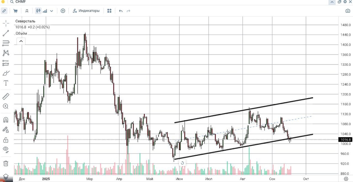 Акции Северсталь. 19.09.25. Акции торгуются у уровня 1000 рублей. Снижение, начавшееся с 10.09.25 от уровня 1100 рублей за акцию, на этой неделе приостановилось у уровня 1000 рублей и три сессии инструмент консолидируется над этим уровнем. Соответственно, на сегодняшний день, уровень 1000 рублей за акцию воспринимается как поддержка, а движение повышательного характера, условные границы которого развиваются с третьей декады мая и отображены на скрине, остается актуальным и на сегодняшний день. Таким образом, если в течении ближайших торговых сессий будет сформирован отскок вверх от значений, близких к текущим, то начнет развиваться очередной этап движения вверх. #CHMF #акции