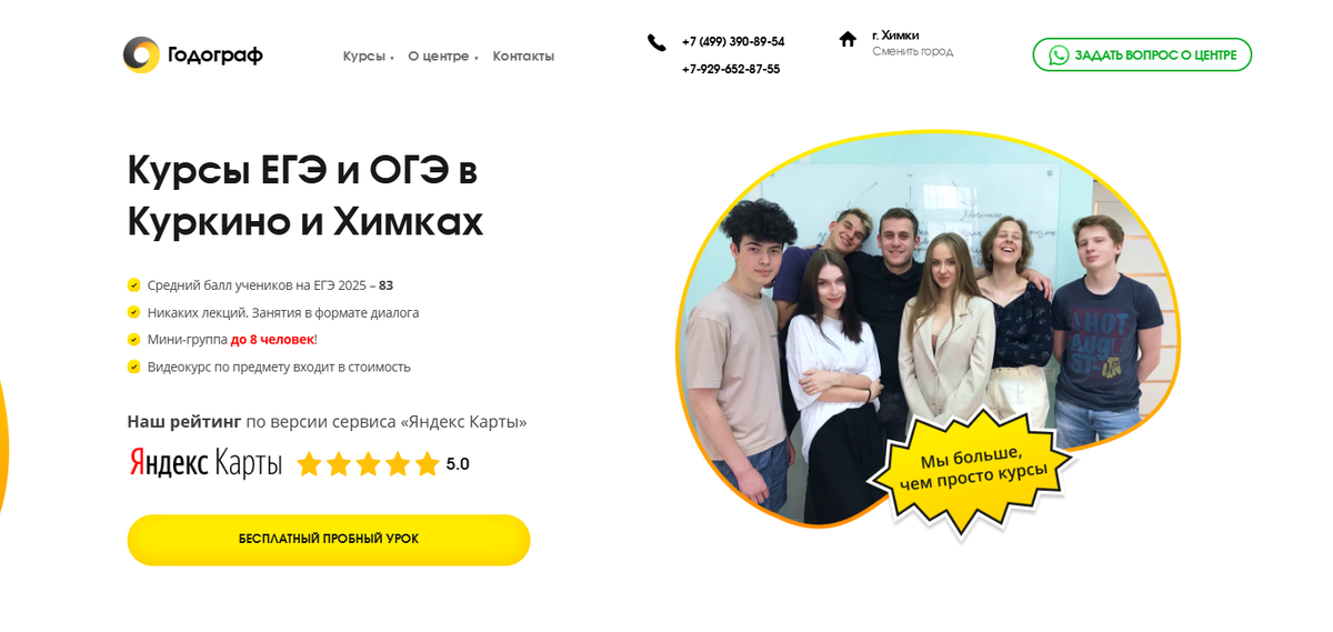 Формат: офлайн + онлайн Описание: федеральная сеть учебных центров с филиалом в Химках. Курсы рассчитаны на учеников 10–11 классов, включают теорию, практику и регулярные пробники.