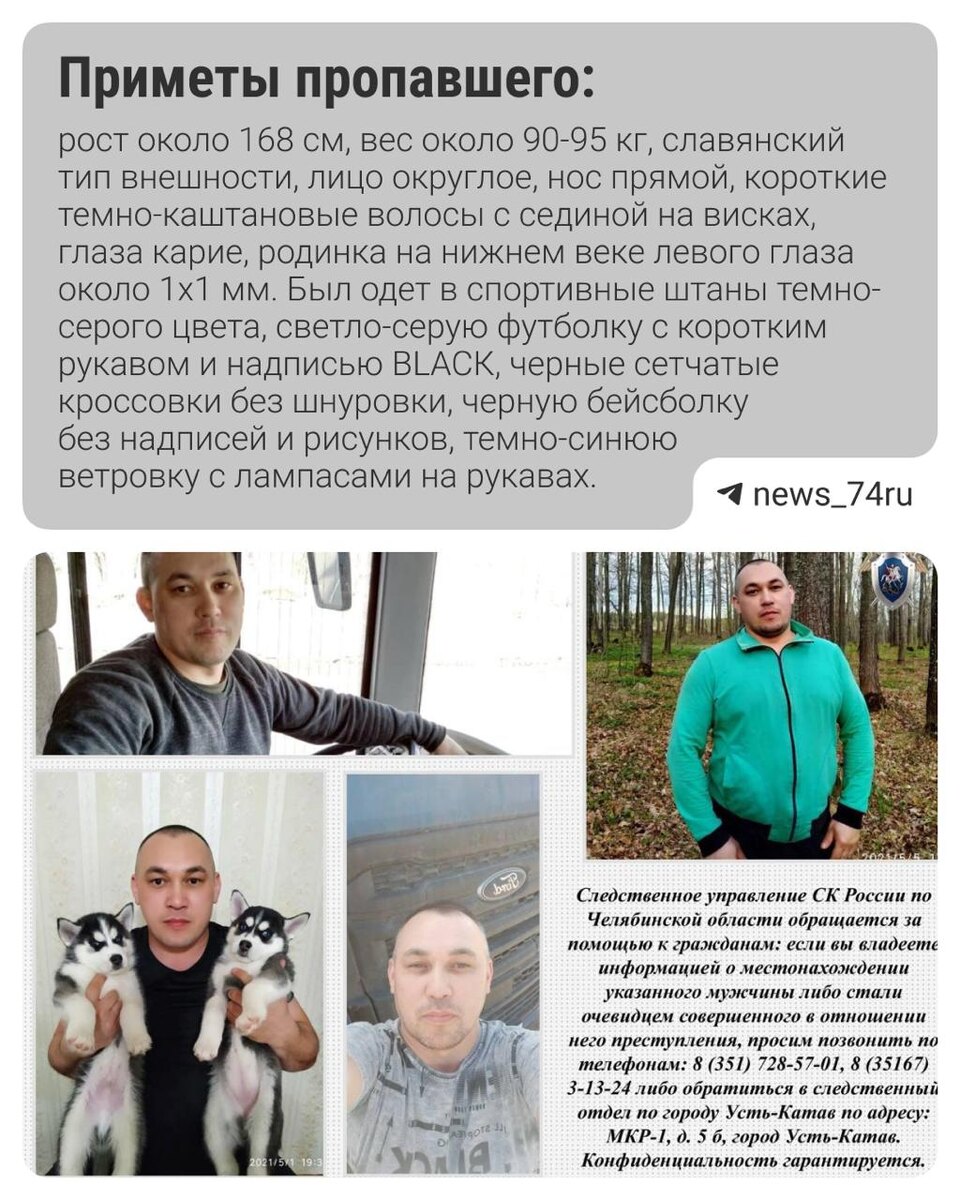 В ответ на пост Загадочно пропавшего на трассе М-5 дальнобойщика не могут найти уже больше месяца В СК возбудили уголовное дело и попросили помочь в поисках Евгения Кудряшова. 🟥 Контекст. Евгений Кудряшов пропал утром 18 августа в Усть-Катавском округе. Его супруга Алена Кудряшова рассказала, что муж ехал обычным рейсом из Новосибирска в Москву, на 1626-м километре трассы М-5 он попал в ДТП, «Скания» съехала с дороги. Через 20 минут на место аварии приехали сотрудники ГАИ, нашли документы, банковские карты, но не водителя. По словам Алены, ничего в поведении мужа не предвещало беды. 📞 Сообщить любую известную информацию можно по телефонам 112, 8 (351) 7265701, 8 (35167) 31324, а также по телефону горячей линии «Лиза Алерт» 8-800-700-54-52.