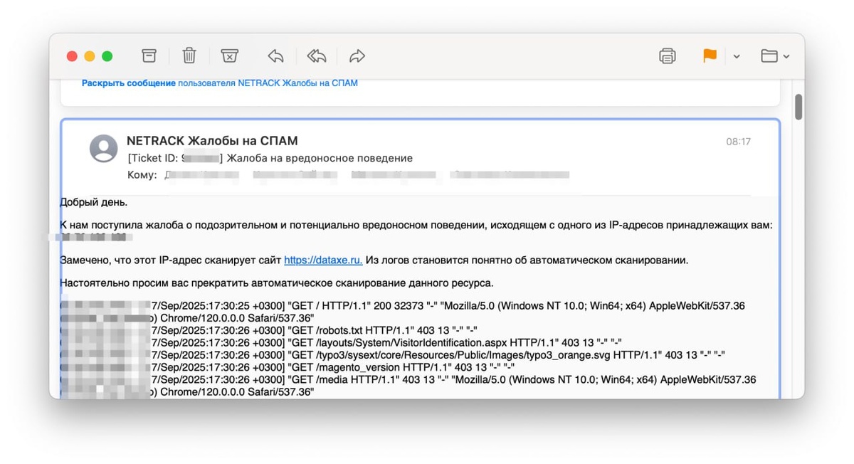 Вот так приходит жалоба на парсинг от хостера. Хостер очень адекватный у нас, просит принять меры, дает время. В данном случае наш парсер зашел на сайт и собрал открытые контактные данные, но владелец возмутился и нажаловался :) На самом сайте странный контент, мутноватый - с таким лучше не связываться вообще. Данного хостера всячески рекомендую, т.к. у них спокойная реакция на такие жалобы, без резких ограничительных мер. Русский ИТ бизнес
