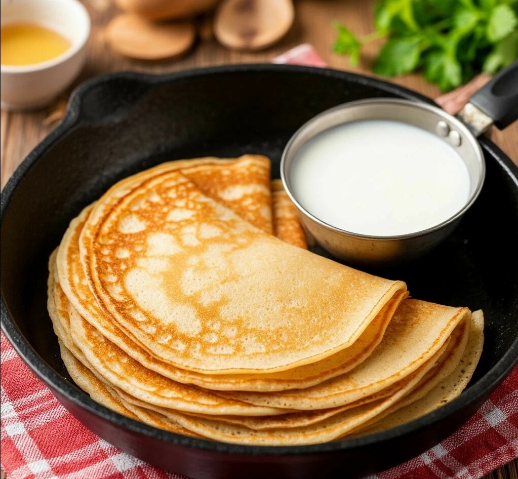 Идеально подходит специальная блинная сковорода с низкими бортиками или просто хорошая чугунная сковорода с толстым дном.