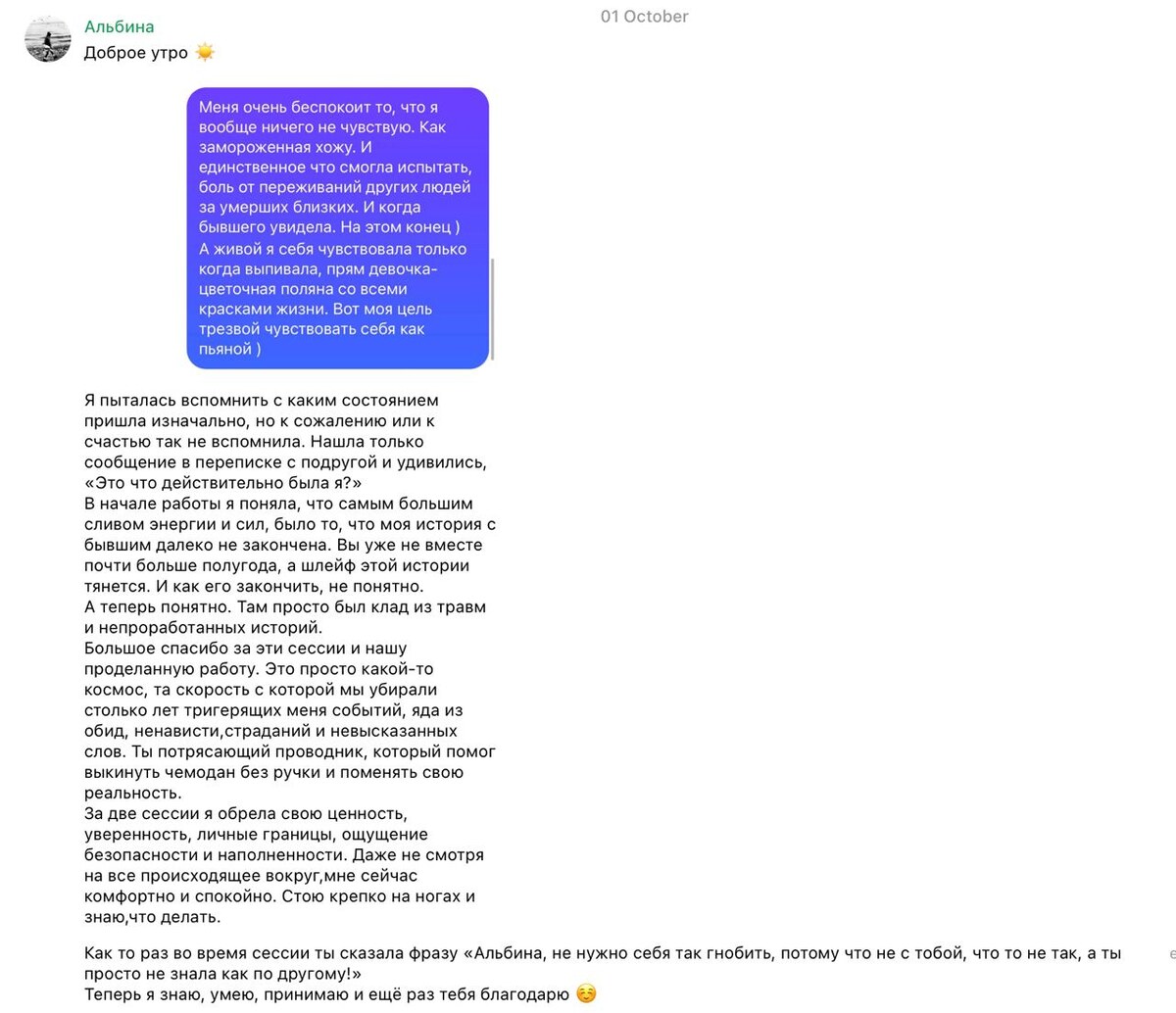 Привет, меня зовут Руфина и я 3 года помогаю женщинам пережить развод и расставание и показываю выход из сложных ситуаций в отношениях. Альбина пришла ко мне с запросом - отношения закончились полгода назад. Ей казалось, что все прошло, прожито и нет никаких эмоций. Но вдруг случайная встреча с ним и она впадает в истерику. Неожиданно все внутри поднялось: страх, злость и ее выбило на несколько дней из жизни от огромной боли и смешанных эмоций. Ее это испугало и она обратилась ко мне. Вся ее ситуация показательна - так бывает, когда женщины не проживают расставание правильно. Негативные эмоции, которые возникают у каждой женщины после разрыва закупорились в ней, как газы в кока-коле, тряслись внутри полгода и при болезненном триггере (встреча с бывшим), просто взорвались унося крышечку куда-то в космос. Мы пошли по стандартному протоколу расставания: 1. Отработали все негативные сцены из отношений. В ходе работы, оказалось, что больно не только от расставания. В самих отношениях