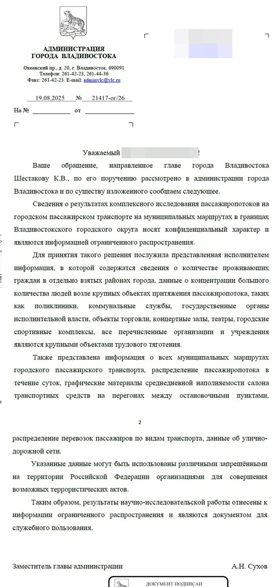 🗣 После запуска автобуса №70 стали появляться вопросы и предложения по нему и по другим маршрутам. Необходимо напомнить, что сейчас они совершенно бесполезны. По заказу мэрии за 8,9 млн было проведено исследование пассажиропотока и представлен доклад с планом по маршрутам транспорта. Аукцион со стартовой ценой в 19,8 млн прошел в декабре. В январе они проводили опрос и конечно это не единственный метод исследования. К началу лета исследования были завершены, все предложения было актуально подавать ДО этого. Однако опубликовать его и предоставить по запроса отказались с формулировкой: Сведения ... носят конфиденциальный характер и являются информацией ограниченного распространения. Сведения о количестве проживающих граждан в отдельно взятых районах города, данные о концентрации большого количества людей возле крупных объектов... Указанные данные могут быть использованы различными запрещёнными на территории Российской Федерации организациями для совершения возможных террористических