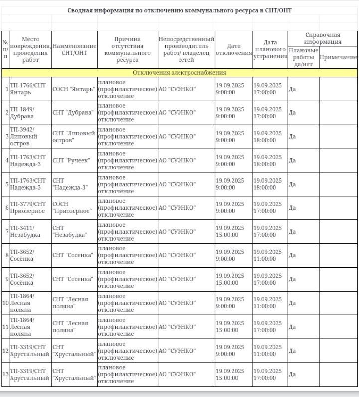 Информация по плановым отключениям в СНТ/ДНТ на 19.09.2025 от ЕДДС города Тюмени