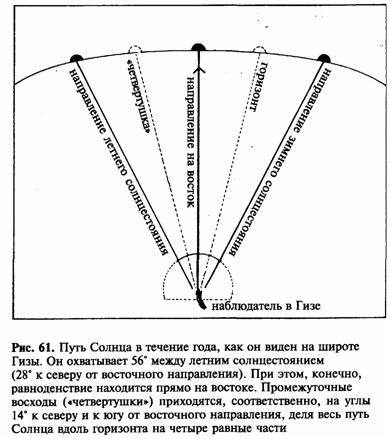Если наблюдать восход солнца на широте Гизы систематически в течение года, то ответ на этот вопрос становится очевидным. Здесь, как и везде на нашей планете, в день весеннего равноденствия солнце восходит точно на востоке; так направлена дорога, ведущая к пирамиде Менкаура, в этом направлении смотрит Сфинкс. Особенностью широты Гизы, как мы уже отмечали несколько раз, является то, что в день летнего солнцестояния (самый долгий день в году) солнце встает на 28° севернее, а в день зимнего солнцестояния (самый короткий день) – на 28° южнее. Эти направления образуют угол 56°. На практике астрономы выделяют, как известно, дни, которые находятся как раз посередине между равноденствиями и солнцестояниями; им соответствуют четвертушки этого угла – 14° севернее и южнее чисто восточного направления. Таким образом, три дороги образуют три гигантских стрелы, характеризующие азимут восхода в день весеннего равноденствия и в дни астрономических «четвертей».