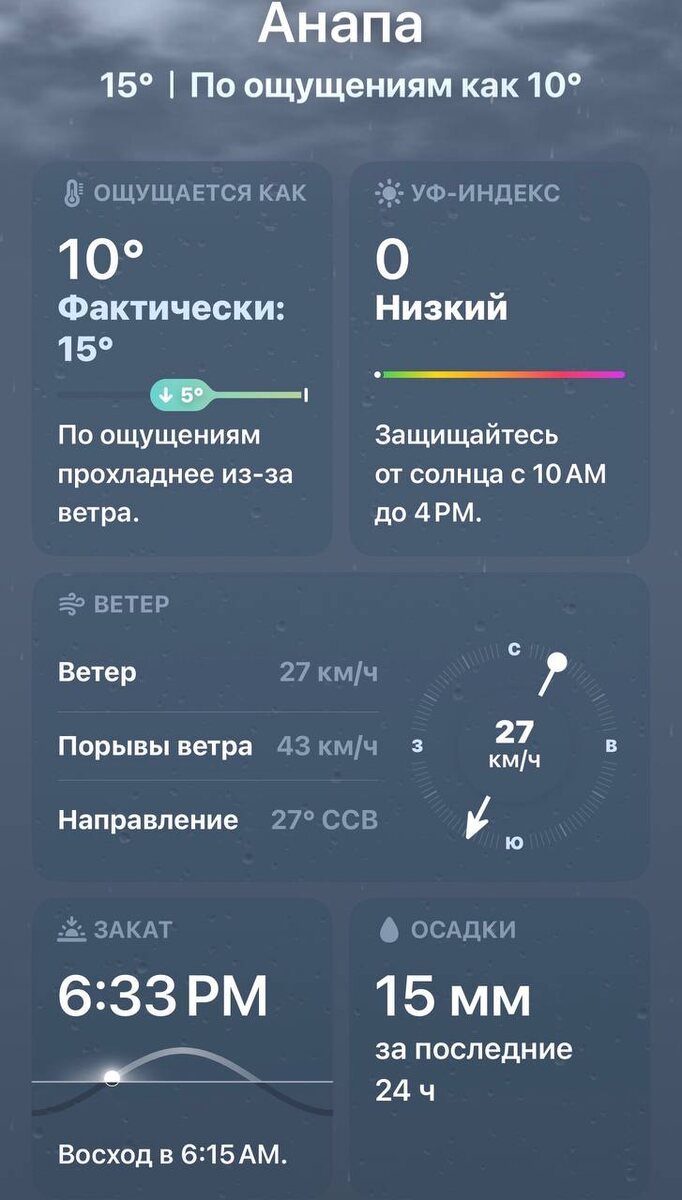 Доброе утро, Анапа! Ожидается облачная погода около 9АМ. Из-за порывов ветра до 43 км/ч 💨 температура ощущается на уровне 10°. Дождь продлится до 8:00 AM местами. 🌨️ Впереди у нас солнечные выходные☀️