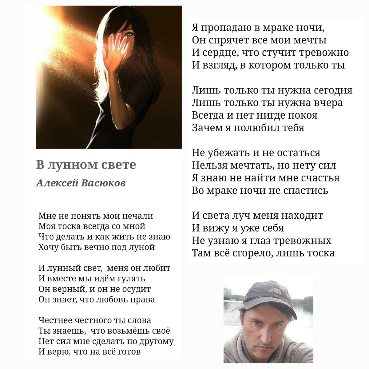 Мне не понять мои печали Моя тоска всегда со мной Что делать и как жить не знаю Хочу быть вечно под луной И лунный свет, меня он любит И вместе мы идём гулять Он верный, и он не осудит Он знает, что любовь права Честнее честного ты слова Ты знаешь, что возьмёшь своё Нет сил мне сделать по другому И верю, что на всё готов Я пропадаю в мраке ночи, Он спрячет все мои мечты И сердце, что стучит тревожно И взгляд, в котором только ты Лишь только ты нужна сегодня Лишь только ты нужна вчера Всегда и нет нигде покоя Зачем я полюбил тебя Не убежать и не остаться Нельзя мечтать, но нету сил Я знаю не найти мне счастья Во мраке ночи не спастись И света луч меня находит И вижу я уже себя Не узнаю я глаз тревожных Там всё сгорело, лишь тоска