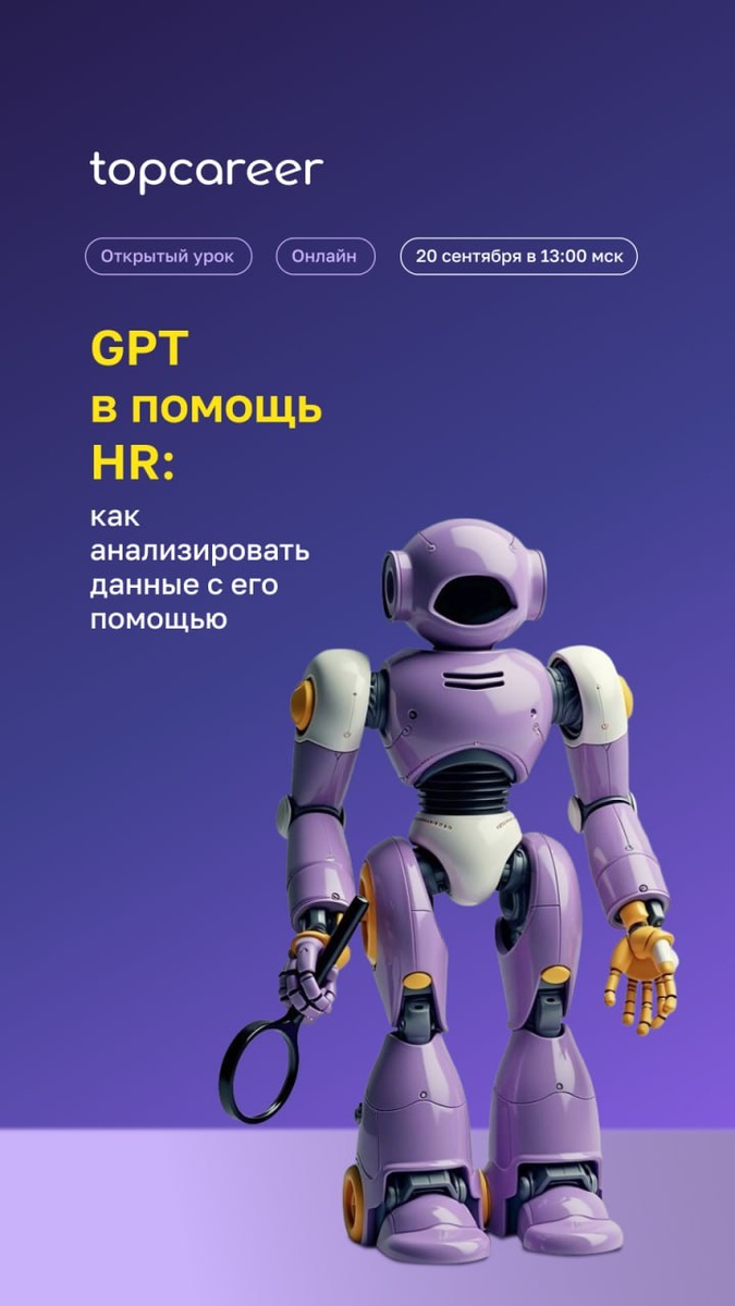 🧎➡️ Как формулировать правильные запросы для нейросетей? 🧎➡️ Как проанализировать HR-метрики через ChatGPT? 🧎➡️ Можно ли автоматизировать создание текстов для аналитических справок, сводок и презентаций? 🧎➡️ Как загружать данные из Excel в GPT и получать от него формулы, рекомендации и инсайты? Ответы на эти вопросы вы можете узнать уже ЗАВТРА в 13:00 мск на нашем бесплатном открытом уроке «GPT в помощь HR: как анализировать данные с его помощью». 💭 Спикер: Николай Писаренко, эксперт по HR-tech и AI с 10+ летним опытом в цифровой трансформации бизнеса. Подробнее о программе урока и о спикере читайте в карточках 🔼 И обязательно РЕГИСТРИРУЙТЕСЬ ❗️