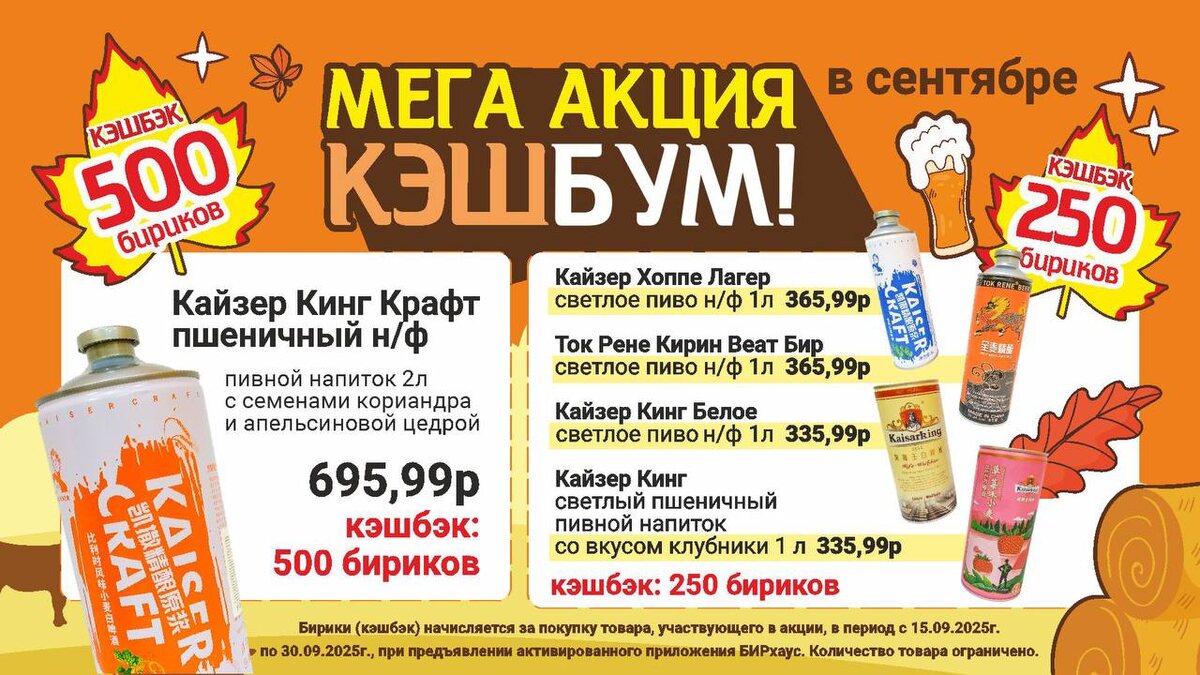 💥 МЕГАакция КЭШБУМ! 💥 Весь сентябрь 2025 года в БИРхаус действует закон пивного притяжения: чем больше берёшь — тем больше возвращается! 🍺💸 🔸 500 бириков при покупке: ✨ Кайзер Кинг Крафт пшеничный н/ф 2 л ж/б, с кориандром и апельсиновой цедрой — 695,99 ₽ 🔸 250 бириков при покупке: 🍺 Кайзер Хоппе Лагер светлое н/ф 1 л ж/б — 365,99 ₽ 🍺 Ток Рене Кирин Веат Бир светлое н/ф 1 л ж/б — 365,99 ₽ 🍺 Кайзер Кинг Белое светлое н/ф 1 л ж/б — 335,99 ₽ 🍓 Кайзер Кинг пшеничный со вкусом клубники 1 л ж/б — 335,99 ₽ 🔥 Количество товара ограничено! 📱 Акция действует по предъявлению активированного приложения БИРхаус 💰 1 бирик = 1 рубль 🎉 КЭШБУМ — это когда пиво радует дважды: сначала вкусом, потом бонусами!