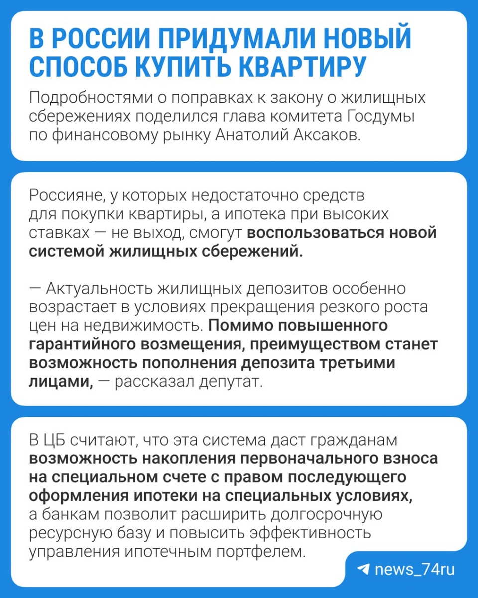 В России может появиться новый способ покупки квартир Этой осенью Госдума рассмотрит законопроект, через который депутаты хотят помочь россиянам накопить деньги на покупку жилья. Что именно предлагают депутаты и чем новый способ будет отличаться от ипотеки, читайте в карточках @74.ru ⬆️