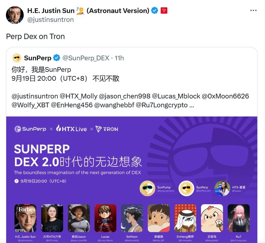 🔸Джастин Сан запускает Perp DEX на Tron