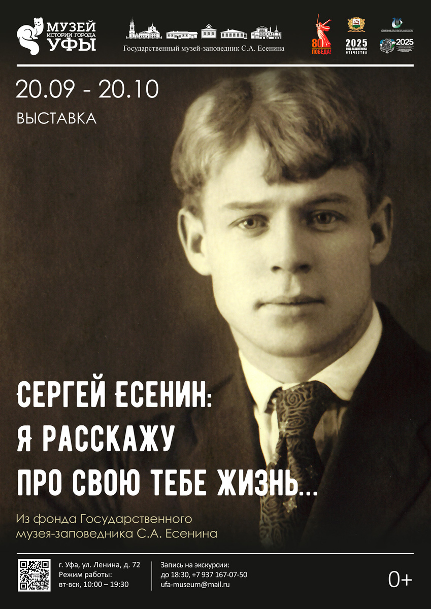 По информации Музея истории города Уфы 20 сентября 2025 года в 12:00 откроется выставка «Сергей Есенин: Я расскажу про свою тебе жизнь…», организованная из фондов Государственного музея-заповедника С.А. Есенина. Сергей Есенин, родившийся 3 октября 1895 года, стал символом русской литературы. Выставка охватывает ключевые этапы его биографии и творчества, включая редкие архивные фотографии, рукописи и публикации. Центральной темой станет его путь от первой публикации в 1914 году до признания в 1915 году в Петрограде. Экспозиция продлится до 20 октября 2025 года.