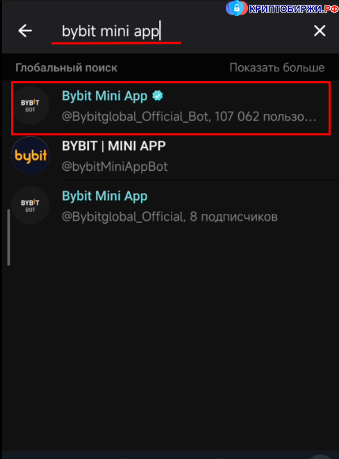 Больше информации о бирже BYBIT можно найти здесь. А наш полный рейтинг криптобирж смотрите у нас на сайте. Дисклеймер: данный материал не является финансовой рекомендацией. Прежде чем инвестировать в любые активы, проведите самостоятельное исследование или проконсультируйтесь с квалифицированным специалистом. Инвестиции и работа с цифровыми активами могут нести повышенные риски и требуют ответственного подхода. Попасть в приложение можно напрямую по этой ссылке. Но для полноценной работой с приложением нам понадобится официальный бот Bybit в Telegram. Бота можно найти через поиск в телеграм, но будьте внимательны и убедитесь, что это подтвержденный, официальный бот. Поиск может выдавать много сторонних аккаунтов с похожим названием — ни в коем случае