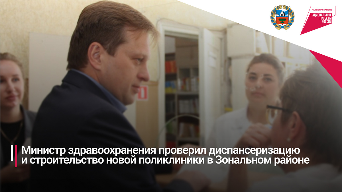 Министр здравоохранения Алтайского края Дмитрий Попов совершил рабочую поездку в Зональный район, где оценил организацию диспансеризации в центральной районной больнице. В ходе визита он прошёл маршрут пациента в рамках проекта «Диспансеризация за один день» и подробно изучил все этапы прохождения обследования.