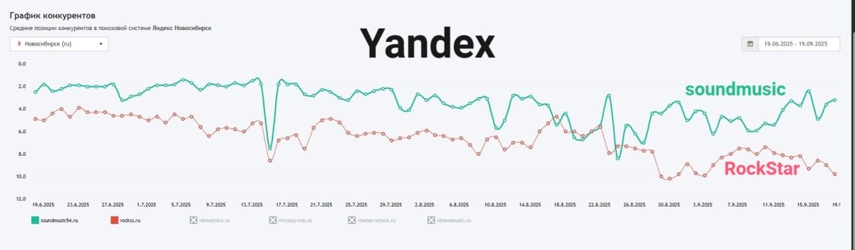 😮 Моя школа гитары soundmusic54.ru конкурирует с очень крутыми ребятами из rockss.ru/ в Новосибирске. Конкуренция сайтов выражается в высоте позиции по 50 ключевым запросам пользователей: школа гитары, уроки гитары, обучение игре на гитаре, курсы гитары и так далее (их 50 основных). Моему сайту - 1 год. Я работаю абсолютно один. Сайту rockstar - 14 лет. Они в 9 городах России. ⚠️ Поисковые системы любят возрастные страницы. К ним больше доверия. На них больше пользовательского опыта. Однако в яндексе у меня получилось вырываться в топ-1 и удерживаться там 4 месяца, где мой сайт soundmusic54.ru на первых позициях по основным запросам (бесплатно по SEO). 🌑 В google наработка доверия идёт гораздо дольше. И я еженедельно наблюдаю сдвиги в лучшую сторону. Скоро и там займу лидирующую позицию, потому что знаю проблемы сайта конкурента и возраст его не спасёт. Планомерно двигаюсь в топ-1 и в google. 🙏 Если хотите поддержать мой проект и меня лично - заходите на страницу soundmusic54.ru