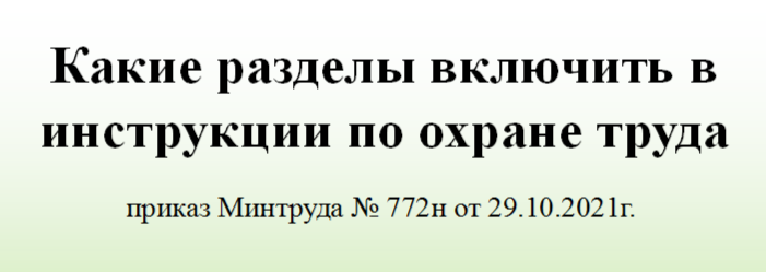 приказ Минтруда № 772н от 29.10.2021г. В инструкции по охране труда включаются все требования, которые указаны в приказе Минтруда от 29.10.2021 № 772н. Раздел 1 «Общие требования охраны труда» В разделе необходимо перечислить: · требование о соблюдении Правил внутреннего трудового распорядка; · требования по выполнению режима труда и отдыха; · перечень опасных и вредных производственных факторов, которые могут воздействовать на работника; · перечень профессиональных рисков и опасностей; · перечень специальной одежды и специальной обуви, других СИЗ, выдаваемых работнику в соответствии с установленными государственными нормативными требованиями охраны труда, или приведите ссылку на ЛНА; · порядок уведомления руководства о травмах, а также неисправностях оборудования и инструмента или приведите ссылку на ЛНА; · правила личной гигиены и эпидемиологические нормы, которые должен знать и соблюдать работник при выполнении работы. Раздел 2 «Требования охраны труда перед началом работы»