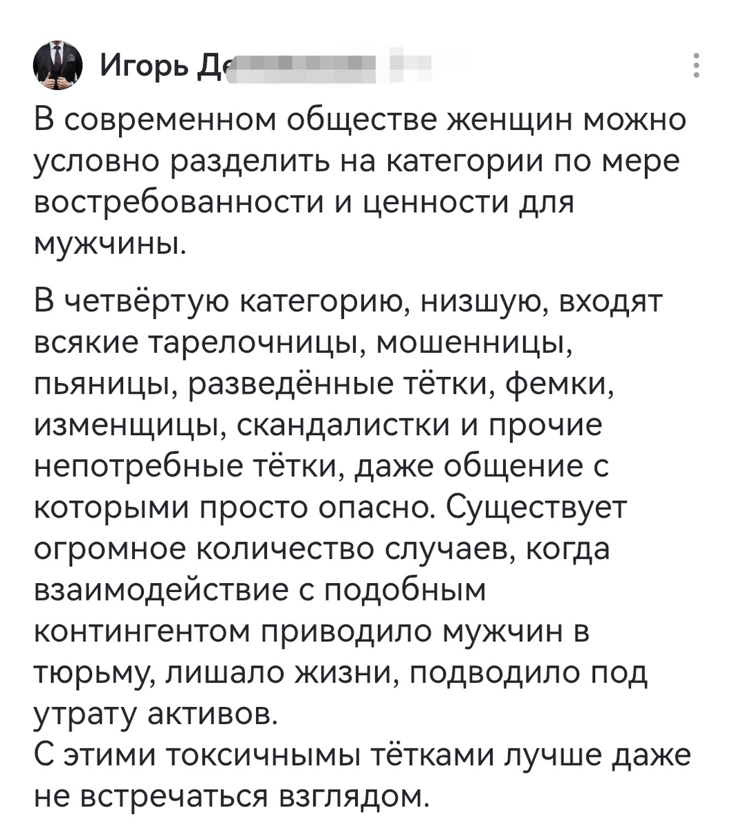 В эту же кучу, пардон, категорию Игорян почему-то свалил разведённых женщин. Видимо, потому что все они (по логике Игорей) мошенницы, так как после развода обдирают своих святых мужей как липку, выставляя с голой *опой на мороз. В скобках заметим: выставляя из своей добрачной квартиры (или квартиры своих родителей), а также не отдавая ему машину, на которой муж имел счастье кататься в браке, но она (вот незадача!) принадлежит тестю.