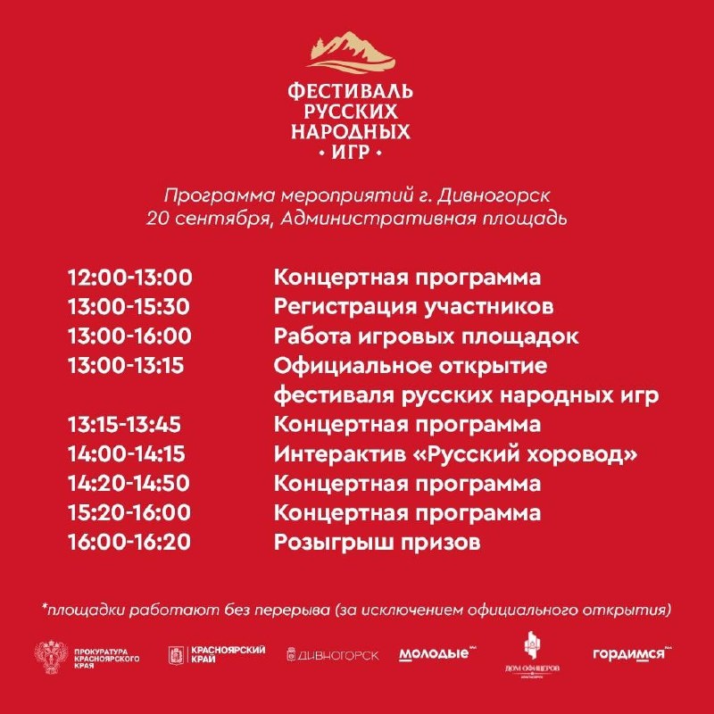 В субботу 20 сентября с 13:00 на Административной площади г. Дивногорска (ул. Набережная, д. 45/1) пройдет фестиваль русских народных игр.