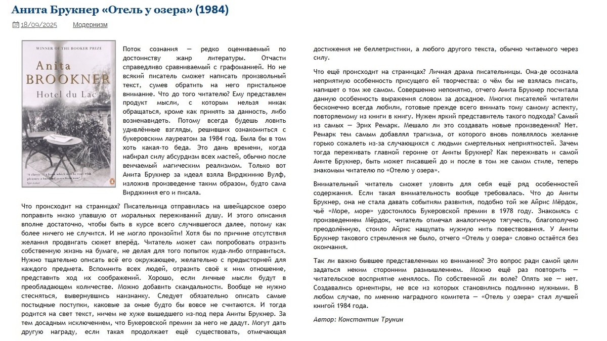 Анита Брукнер "Отель у озера" (1984) | Критика