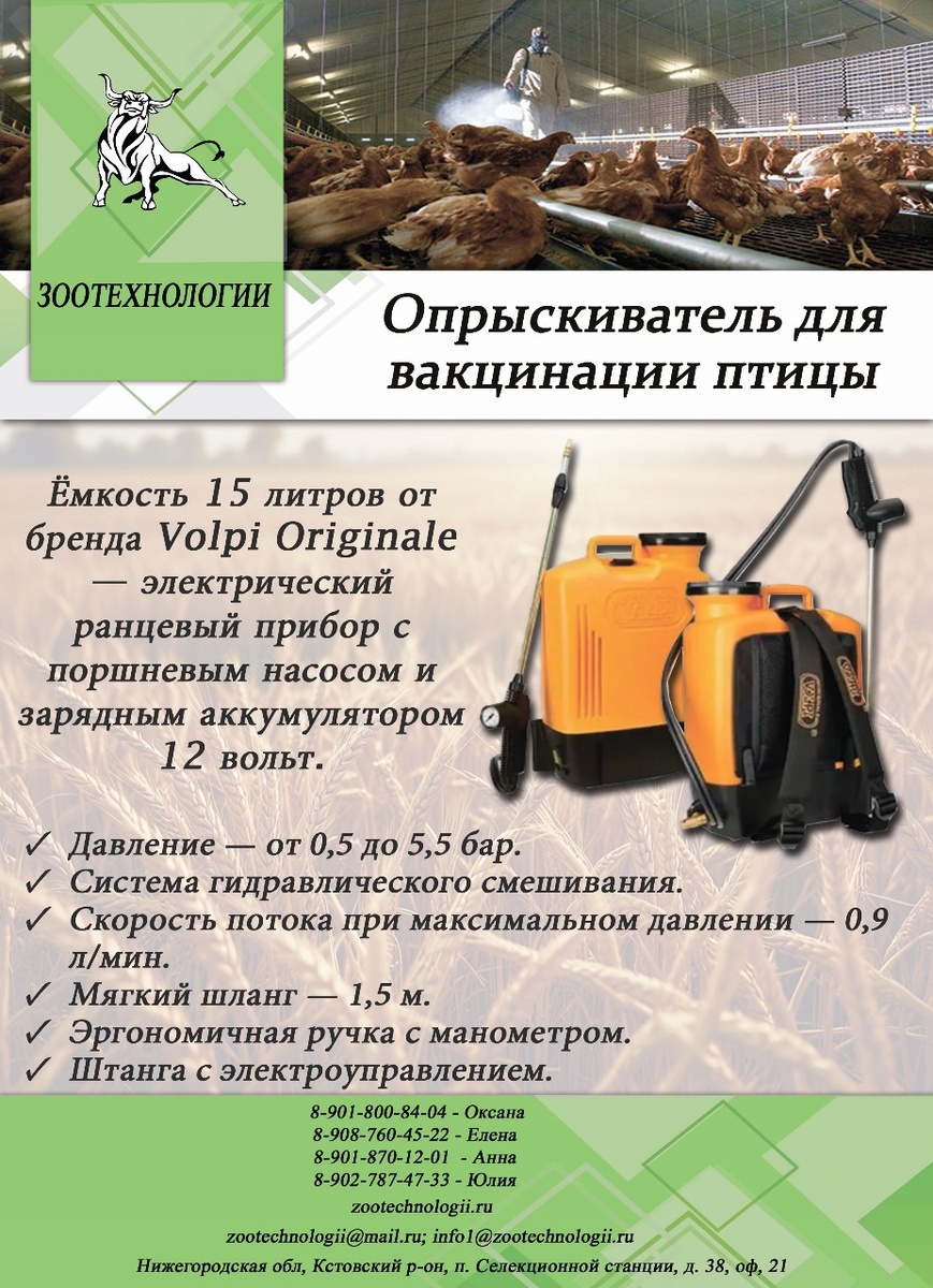 Добрый день. В продаже опрыскиватель для вакцинации птицы VOLPI ELEKTROLITHIUM, 15 л, электрический, Volpi Originale — профессиональное оборудование для распыления дезинфицирующих средств. Некоторые характеристики: ✅бак из полиэтилена HD, съёмный фильтр; ✅поршневой электронасос из нержавеющей стали с высокой производительностью и шаровыми кранами; ✅аккумулятор 12V, зарядное устройство; ✅давление — от 0,5 до 5,5 бар; ✅скорость потока при максимальном давлении — 0,9 л/мин; ✅длина шланга — 1,5 м; ✅эргономичная ручка с манометром; ✅телескопическая штанга 55–100 см с двуствольным разветвлением и двойным регулируемым латунным соплом; ✅набор форсунок для вакцинации (115, 150 и 240 микрон); ✅вес нетто — 5 кг. Опрыскиватель подходит для садоводства, агрикультуры и вакцинации. Вся продукция Volpi соответствует сертификату качества ISO 9001:2015. Купить опрыскиватель можно у нас: Оксана: 8-901-800-84-04 Елена : 8-908-760-45-22 Анна: