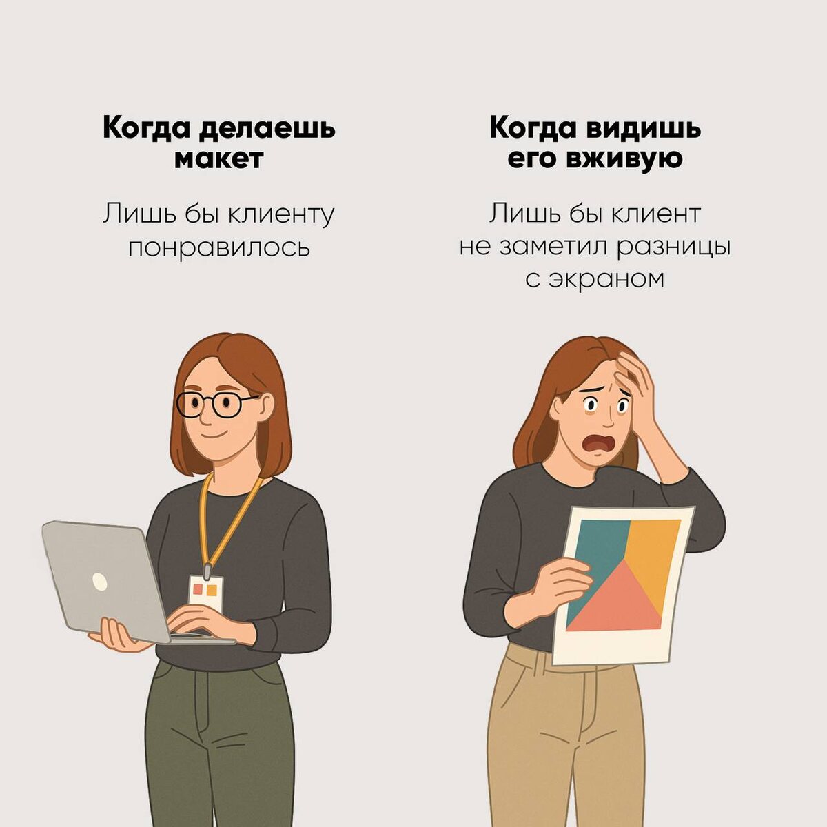 Когда делаешь макет → бог дизайна. Когда видишь его вживую → сам готов молиться всем богам. Мы все через это проходили: ✔️ уверенность «цвета будут как на экране» ✔️ вера «типография сама поправит» ✔️ шок «это же был бежевый!» Все мы с таким сталкивались, правда же? А теперь вопрос к вам: у кого из типографии вернулся самый эпичный фейл? 😅 Вёрстка для дизайнера