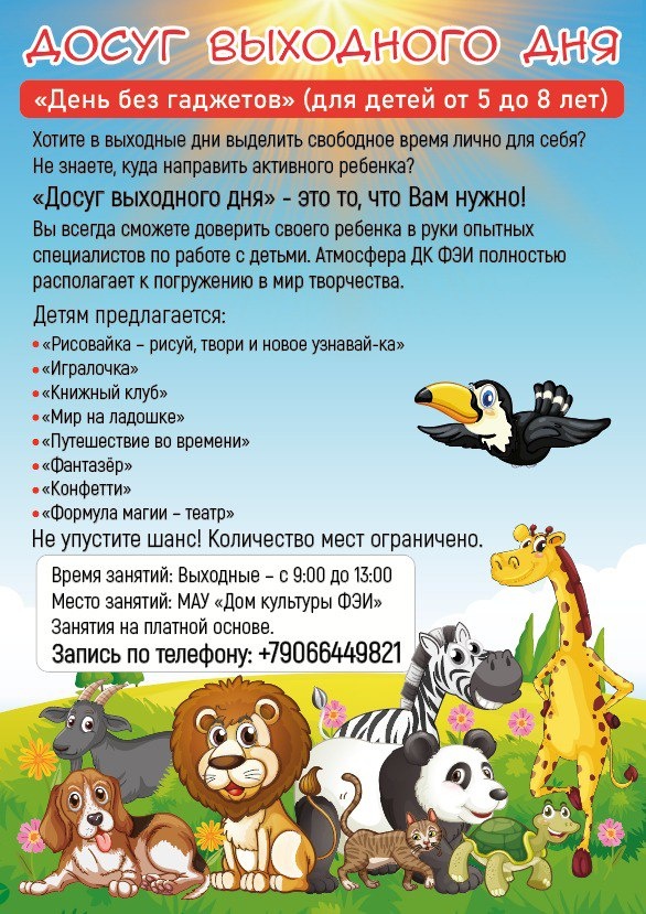 В ДК ФЭИ продолжается программа «Досуг выходного дня» (для детей от 5 до 8 лет). Её цель — организация полезного и разнообразного отдыха для детей. Занятия проходят в безопасной и комфортной обстановке под руководством специалистов по работе с детьми. В программу входят мастер-классы, интерактивные игры, творческие и спортивные активности. Дети могут попробовать себя в рисовании, рукоделии, театральных постановках и других направлениях. «Досуг выходного дня» даёт возможность ребятам интересно провести время, развивать творческие способности и получать новые впечатления. ⏰Время занятий: Выходные с 9:00 до 13:00 Занятия на платной основе. ✍Запись по телефону: +79066449821 Обнинск, пр-т Ленина, 15. 👍 Подписаться | Ваша реклама