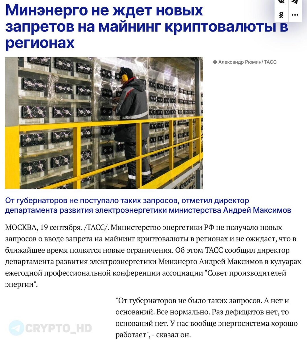 🇷🇺 В России НЕ ожидается новых запретов на майнинг в ближайшее время – Минэнерго Crypto Headlines