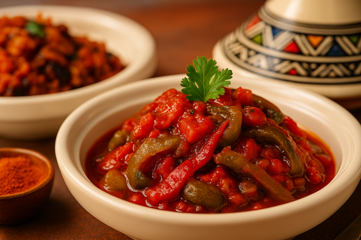 История тактуки — это не история королевских пиров или сложных яств, подававшихся при дворе султана. Это история простых людей, земли и невероятной изобретательности, рожденной в скромных условиях. Это история о том, как всего несколько доступных ингредиентов, сдобренных щедрой рукой марокканской хозяйки, превращаются в кулинарный шедевр. Тактука — младшая сестра знаменитого заалука. Она родилась в берберской кухне, когда хозяйки использовали жар очага не только для тажина, но и для быстрого овощного блюда. Помидоры, сладкий перец, чеснок и немного специй — и вот уже готова закуска, которая хранит урожай и дарит вкус солнца и земли. Тактука, как и ее знаменитый «старший брат» заалук (салат из баклажанов), родом из берберской кухни — древнейшей в Северной Африке. Ее происхождение просто и гениально: это блюдо родилось как необходимость. Предста