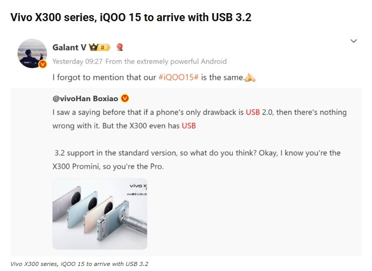 Компания Vivo официально подтвердила, что грядущие модели X300, X300 Pro и iQOO 15 будут оснащены портом USB-C 3.2 — что даст пользователям куда более высокую скорость передачи данных по сравнению с USB 2.0. Gizmochina USB 3.2 значительно быстрее USB 2.0, а значит передача больших файлов — фото, видео — станет гораздо удобнее. Gizmochina Пользователи смогут быстрее синхронизировать устройства с ПК и пользоваться внешними накопителями без ограничений по скорости. Источник: Gizmochina — “Vivo X300, X300 Pro, iQOO 15 to feature USB 3.2 port” Gizmochina