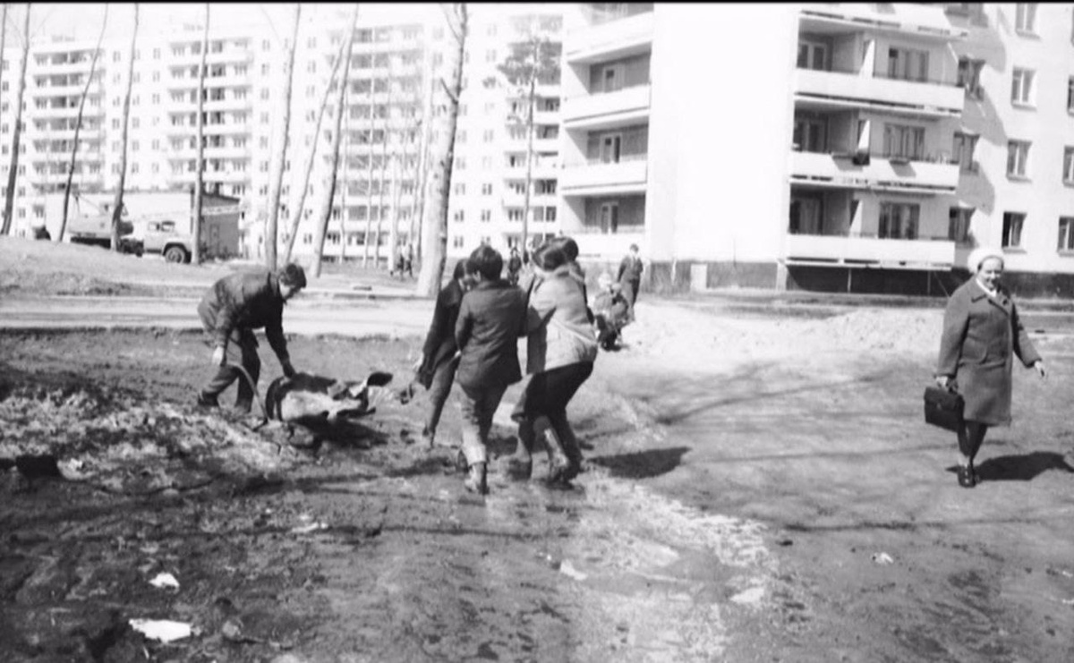 ФОТО ИЗ ПРОШЛОГО На весенней фотографии 1976-го года школьники собирают металлолом на участке, который в настоящее время находится между тротуаром к 121-ой школе и детсадом "Кораблик". По тропинке от Тружеников, 9 к школе идёт учительница химии Анна Владимировна Силантьева. А вот дома Тружеников, 7 ещё нет, его строительство начнётся в самое ближайшее время.