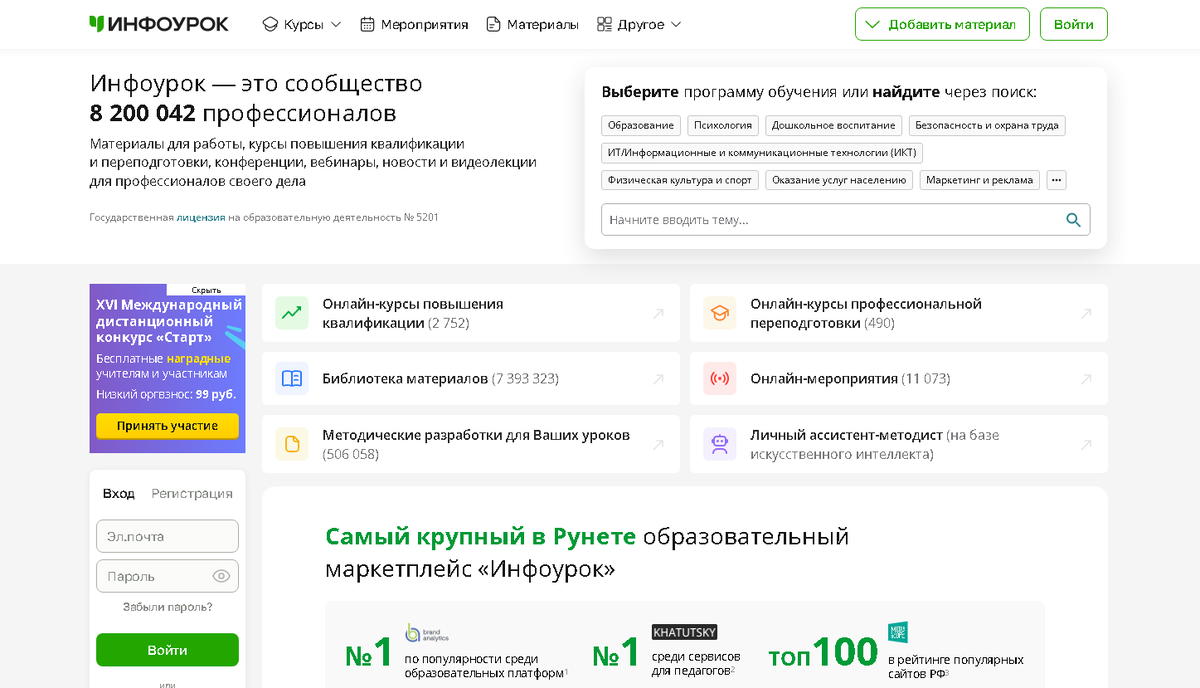 Инфоурок — это платформа, предоставляющая онлайн-курсы и образовательные материалы для учащихся, учителей и всех, кто хочет расширить свои знания. Сайт предлагает широкий выбор обучающих программ по самым разным предметам: от математики и русского языка до программирования и психологии. Инфоурок помогает как школьникам, так и взрослым получить доступ к качественному образованию, не выходя из дома, и подходит как для новичков, так и для тех, кто желает углубить свои знания.