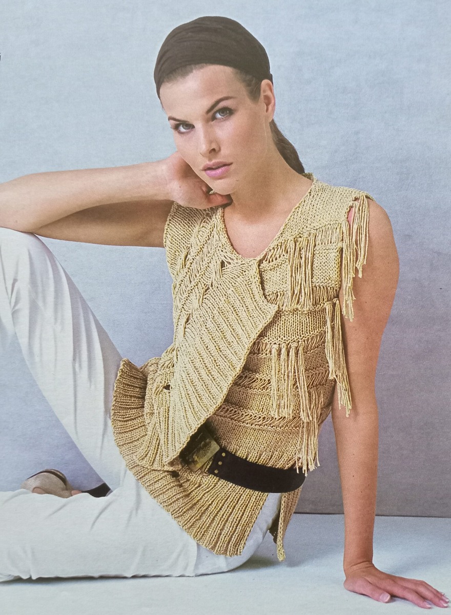 Жилет песочно-зеленого цвета. Оригинальный, украшенный бахромой, жилет с широкой ниспадающей планкой заинтересует всех. для кого в одежде важен не только внешний вид, но и комфорт. 44/46 (48/50). Отличающиеся данные для размера 48/50 приведены в скобках. 400 (450) г пряжи песочно-зеленого цвета (50% шелка, 50% вискозы; 85 м/ 50 г); спицы №5,5; крючок №6. Резинка: попеременно 2 лиц., 2 изн. Лицевая гладь: лиц. р. - лиц. п.; изн. р. - изн. п. Узор А: 1-й р. (=лиц. р.): изн. п. 2-й р.: лиц. п. 3-й р.: все п. лиц., трижды обматывая правую спицу для каждой п. (=2 накида). 4-й р.: все п. изн., распуская накиды и вытягивая п. 5-й р.: изн. п. 6-й р.: лиц. п. Узор В: количество п. кратно 8 + 2 кром. 1-й р.: (лиц. р.): лиц. п. 2-й р.: все п. изн., трижды обматывая правую спицу для каждой п. (= 2 накида). 3-й р.: кром., * снять 8 п. изн., распуская накиды и вытягивая п. Перенести 8 п. обратно на левую спицу. Затем снять 4 п. на вспом. спицу и оставить за работой, 4 лиц., 4 лиц. п. со вспом. спицы