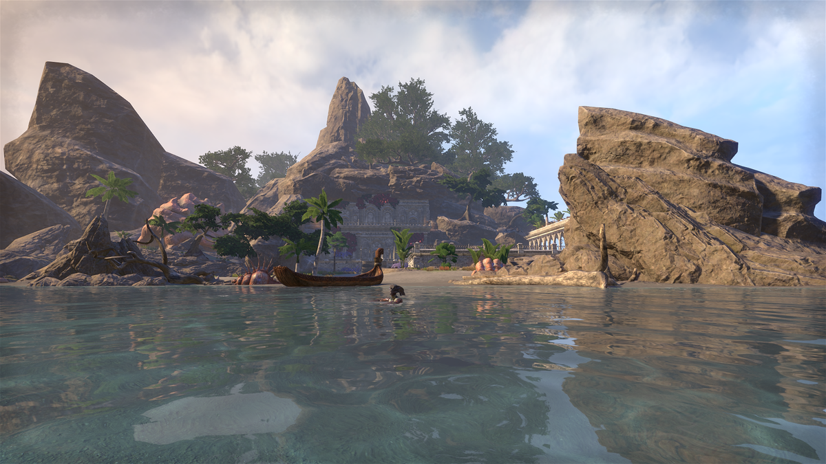 Я недавно пыталась провернуть схему, чтобы купить виллу «Морской цветок» в Ауридоне. Но Стим автоматически создал второй аккаунт в игре. Короче, не получилось, но вдруг я увидела на Солстисе собственный остров, и он лучше по всем параметрам. Идеальный остров с алинорской архитектурой и бассейнами. Он даже без обстановки выглядит очень уютно. Останется кинуть пару столов, стульев, раскидать коврики и полотенца. Можно будет добавить плетеных аргонианских конструкций. Я добавлю легкую мебель, скорее всего аргонианскую плетеную. Но не хочется делать из дома гавайский отель, поэтому придется разбавить чем-то изящным, например вампирской мебелью. Посмотрим оба варианта, а потом решим. С алинорской архитектурой пойдет и то, и другое как по мне. Интересно, кстати, как дом выглядит ночью, надеюсь, там тоже можно будет сменить погоду. Дом уже украшен растениями и аллеями. Пальмы уже натыканы по пляжу. С одной стороны даже лежит гигантское морское животное. Я пока не нашла способ к нему выйти, та