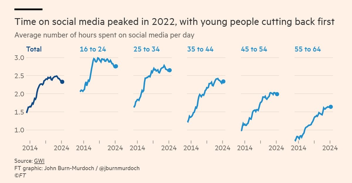 Время, проводимое пользователями в соцсетях, достигло пика в 2022 году и с тех пор стабильно снижается
