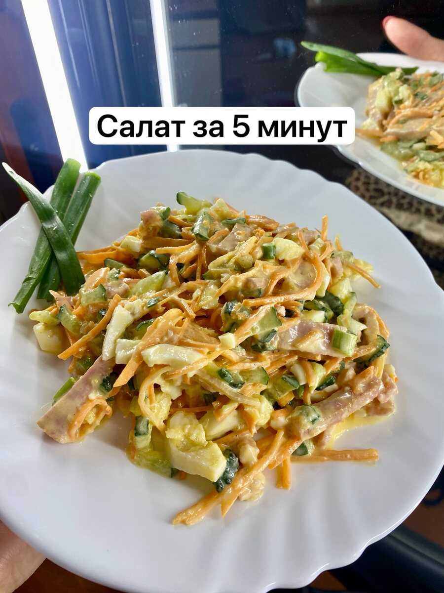 если любите кукурузу- смело её туда же Необходимо: 2 яйца, 2 огурца, ветчина, лук зелёный, майонез, морковь по-корейски 1️⃣яйца после закипания варить 5-7 мин (тут уж какую консистенцию любите) 2️⃣в это время порезать соломкой огурец и ветчину 3️⃣если морковь длинная, то тоже порезать 4️⃣мелко порезать зеленый лук, поперчить и добавить майонез 5️⃣яйца некрупно порезать и всё перемешать Вообще приготовила его из того, что оказалось в холодильнике.