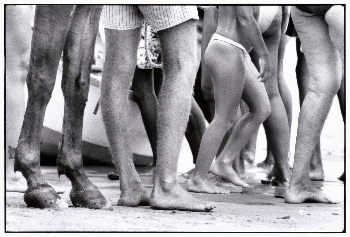 Начнем с кадра, где пляжный людской муравейник смешался с конскими ногами. Камера опустилась на уровень щиколоток, вся драма пляжа проходит в зоне носков и копыт. Контраст мягкой кожи и потрескавшихся ребер подков работает лучше любой подписи. Буквально один срез реальности, но бьет по касательной ко всей истории жаркого дня, собрав случайных людей и животное в общий ритм.