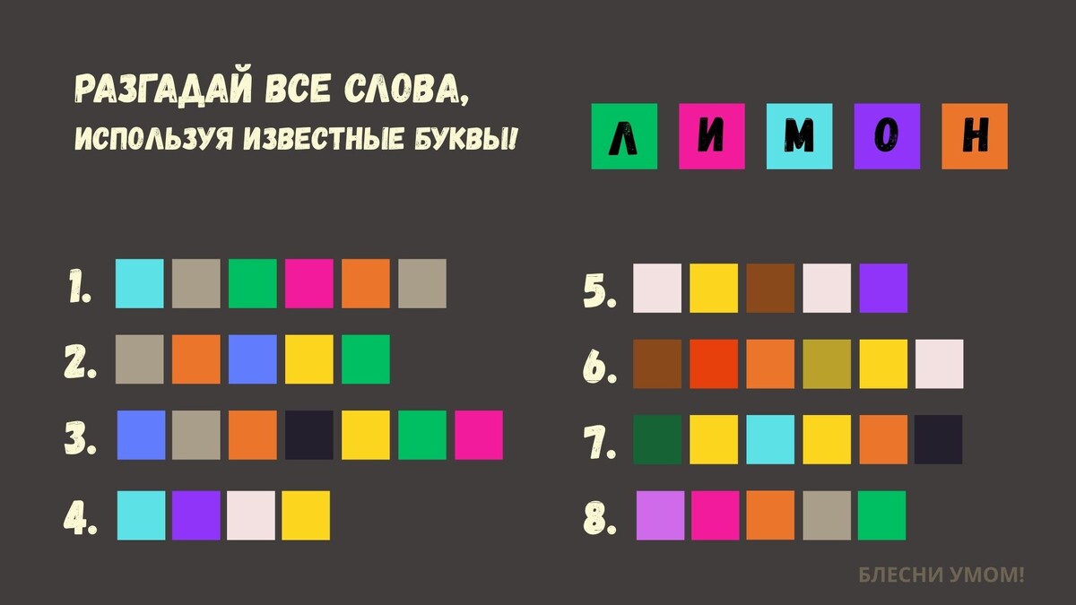 В мире головоломок и шифров существует особая категория задач, где логика встречается с визуальным восприятием. Цветовая криптограмма — это не просто игра с буквами, это настоящее испытание для ума, в котором каждая буква алфавита закодирована определённым цветом. Ваша задача — расшифровать слова. Пять букв уже известны. Не составит труда найти и остальные. Готовы бросить вызов своему мышлению? Тогда приступим к разгадыванию цветовой криптограммы! 🎨🧠 Встречаемся в комментариях, друзья!👇 ✔Подпишись и поставь лайк👍, если не трудно - это мотивирует! Ещё больше интересных заданий ищи здесь!