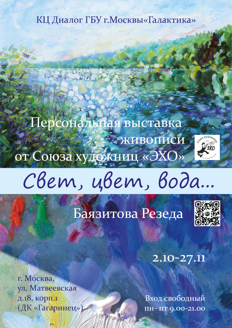 📍 Место: КЦ Диалог ГБУ г.Москвы «Галактика», ул. Матвеевская 18, к. 1 Приглашаем вас на персональную выставку художницы из Казани Резеды Баязитовой. Тема "Свет, цвет, вода" объединяет все картины. Солнечный свет и тени вдохновляют художницу, что отражается в выразительных световых решениях ее работ. Даже в пасмурные дни она передает легкую дымку и внутренний свет, символизирующий гармонию и покой. Яркие цвета и фактурные мазки радуют насыщенной палитрой, смело передавая восприятие мира. Вода в картинах Резеды — это обновление и очищение, показанное через движение и состояние воды, расширяющее пространство и погружающее зрителя в стихию. Художница стремится передать красоту природы, радость созерцания и умиротворение.